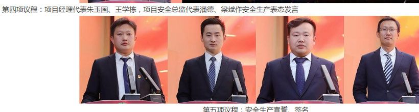 四、項(xiàng)目經(jīng)理代表朱玉國(guó)、王學(xué)棟,項(xiàng)目安全總監(jiān)代表潘德、梁斌作安全生產(chǎn)表態(tài)發(fā)言;