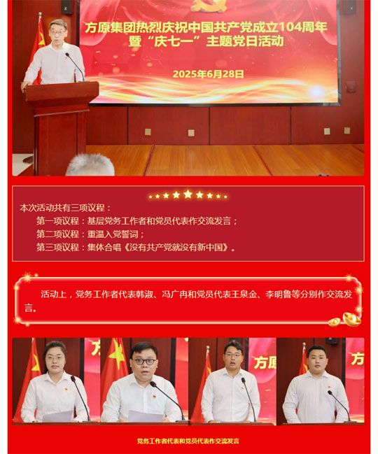 6月28日,方原集團黨委組織開展慶祝中國共產黨成立104周年暨慶“七一”主題黨日活動。